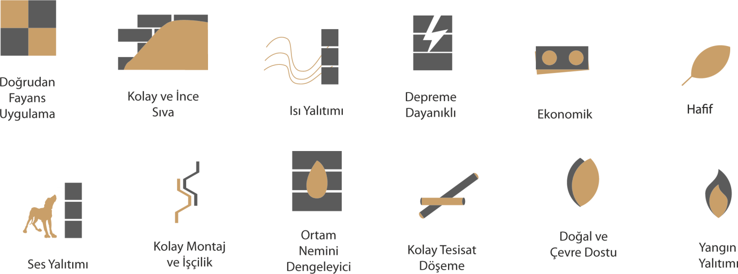 Standart ölçüleri ve uygulama kolaylığı ile ekonomik duvar örme imkânı sağlayarak işçilik ve zaman planlamasında avantaj sunabilir.